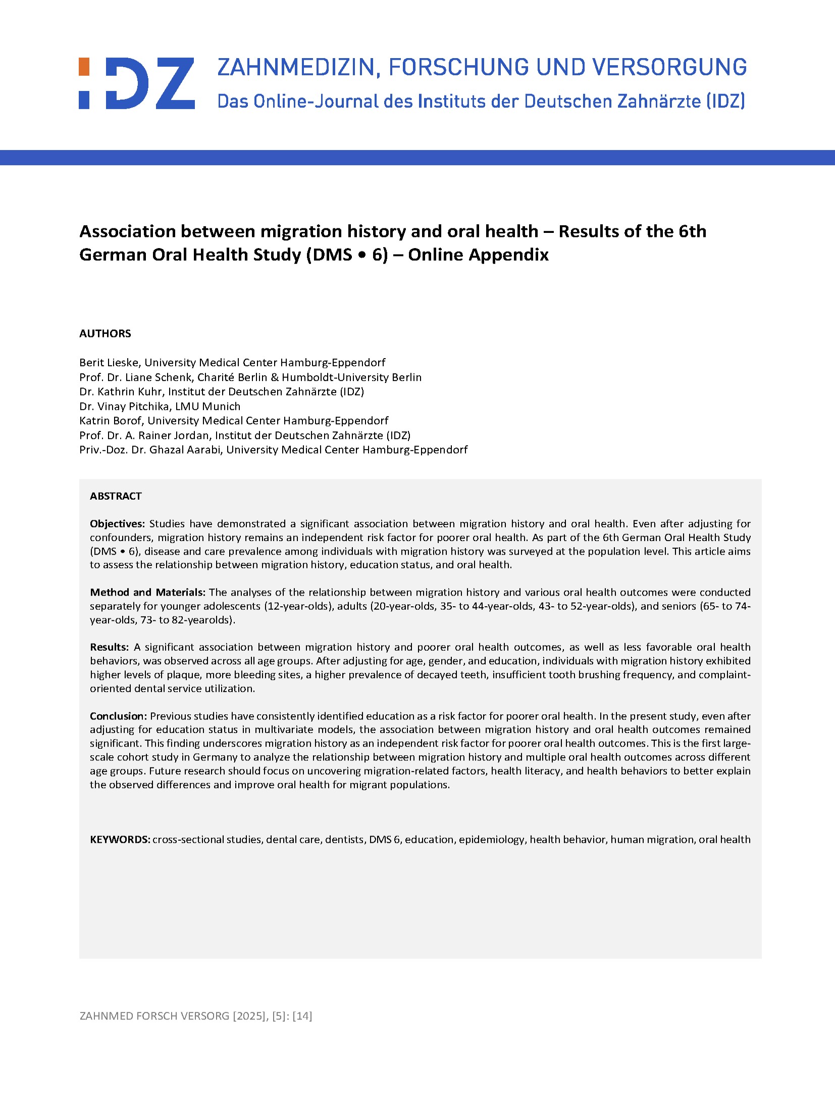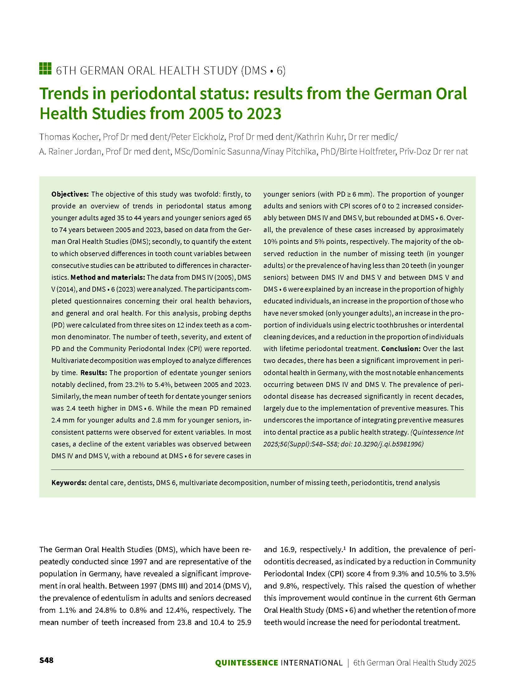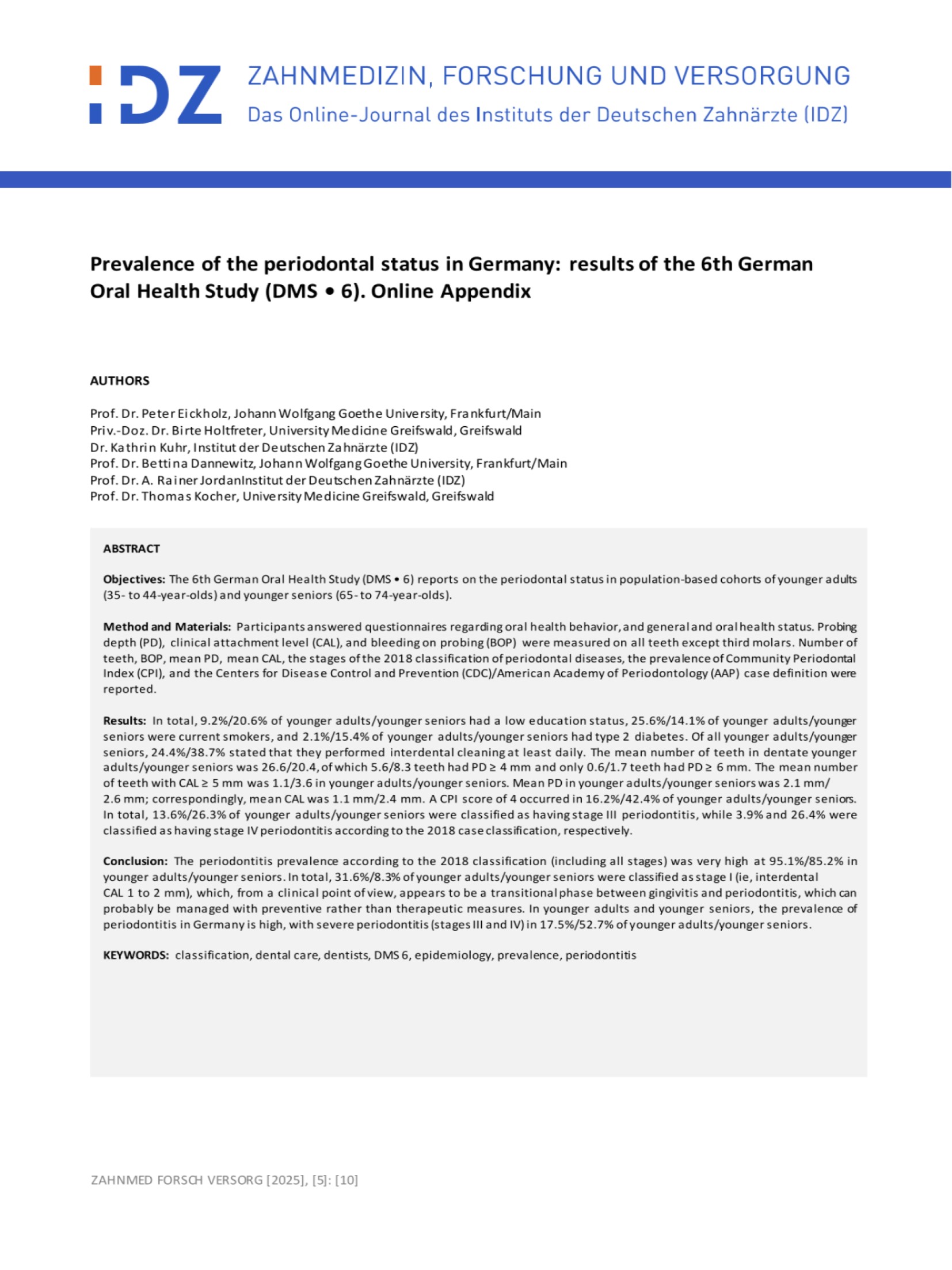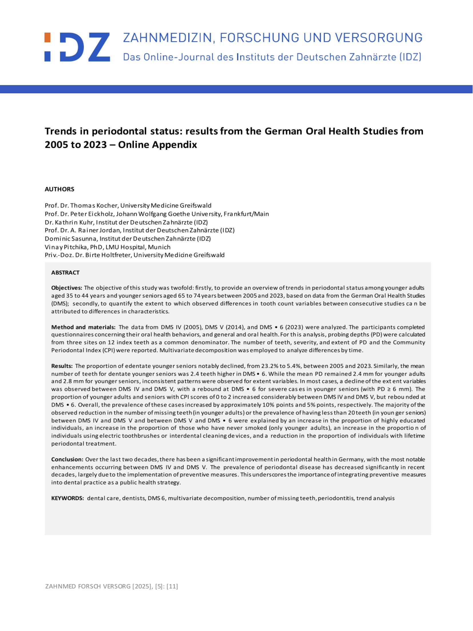 Diese Studie verfolgt zwei Hauptziele: Erstens soll ein Überblick über die Entwicklungen des parodontalen Zustands bei Erwachsenen im Alter von 35–44 Jahren und Senioren im Alter von 65–74 Jahren zwischen 2005 und 2023 anhand der Daten der Deutschen Mundgesundheitsstudien (DMS) gegeben werden. Zweitens soll quantifiziert werden, inwieweit beobachtete Unterschiede bei Zahnzahlvariablen zwischen aufeinanderfolgenden Studien auf Unterschiede in den individuellen Merkmalen zurückzuführen sind.