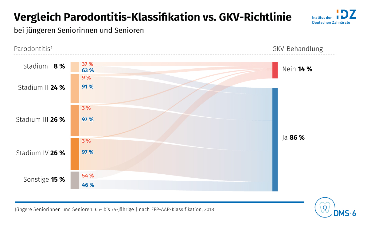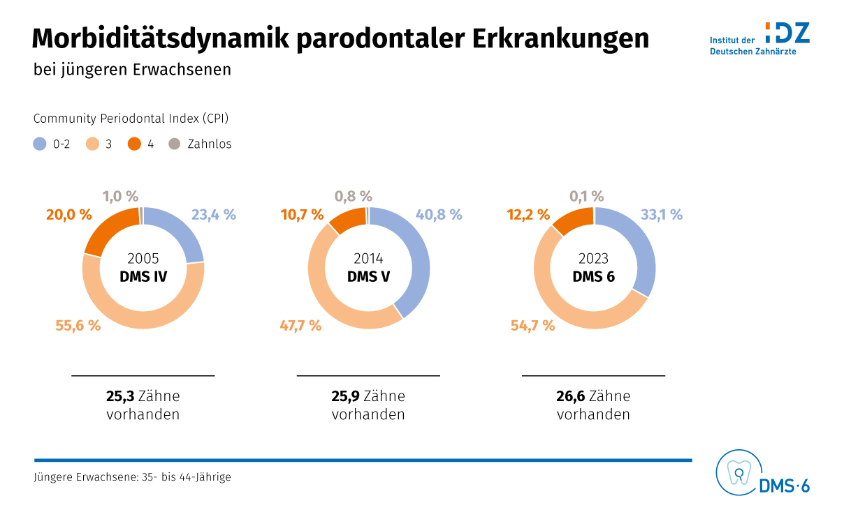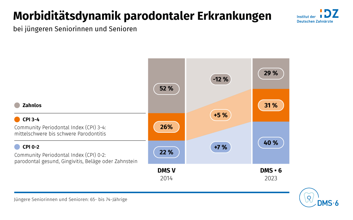 Im Rahmen der Sechsten Deutschen Mundgesundheitsstudie (DMS • 6) wurde der Parodontalstatus der jüngeren Erwachsenen (35- bis 44-Jährige) und der jüngeren Seniorinnen und Senioren (65- bis 74-Jährige) ermittelt.