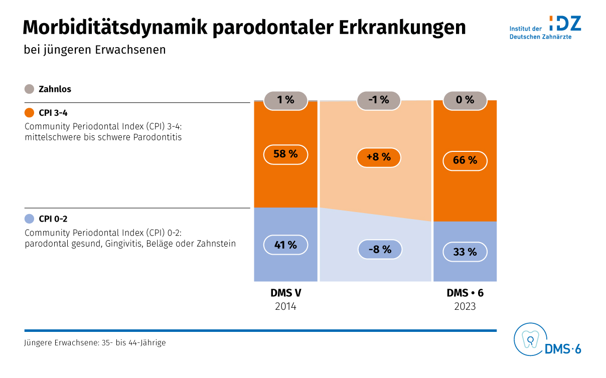 Die Prävalenz von Parodontitis ist bei jüngeren Erwachsenen und jüngeren Seniorinnen und Senioren in Deutschland hoch und liegt bei schweren Formen der Parodontitis (Stadium III und IV) bei 17,5 %/52,7 %.